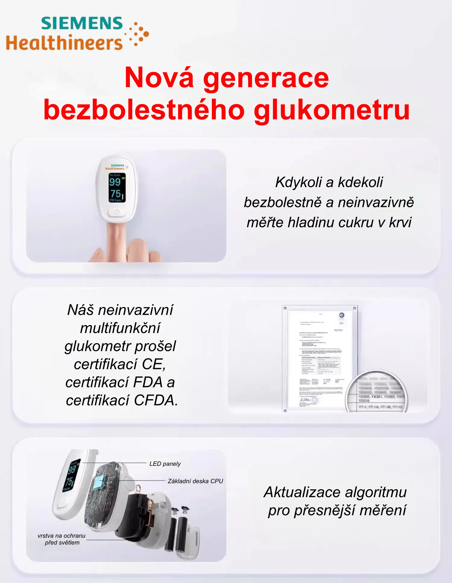 Náš neinvazivní multifunkční glukometr prošel certifikacemi CE, FDA a CFDA. Jeho přesnost měření je vysoká a shodná s výsledky měření profesionálních zdravotnických zařízení. Objednávejte s důvěrou.